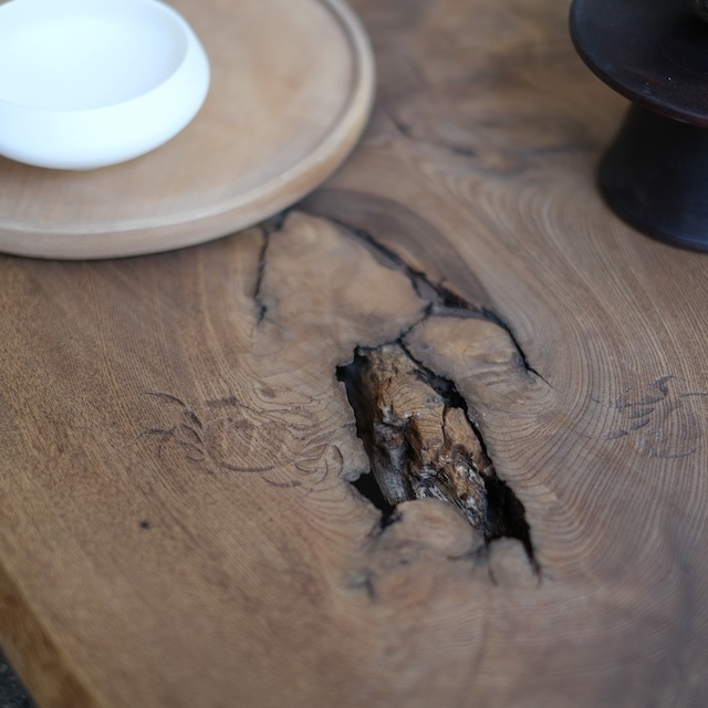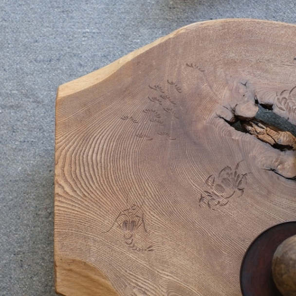 成形しすぎず自然のままの造形を取り入れた展示台。縁が木のままで無骨な感じが素敵です。天板には所々に「蟹」「海老」「松」の彫刻がさりげなく入っています。遊び心がありますね。