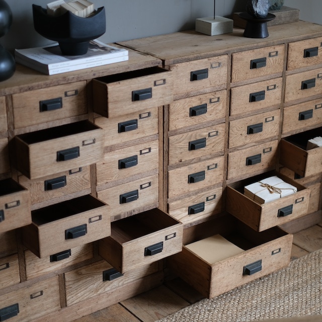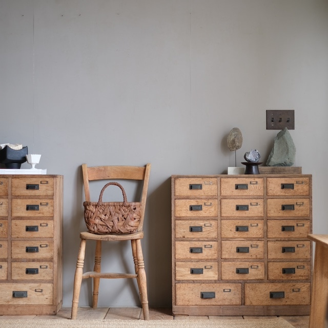 引き出しがお揃いで入荷しました。同じ物だから横並びにすると主役級の家具になり、とても存在感がありますね。もちろん別々に使うことができますので、ライフスタイルの変化によって、使い方をアレンジできるところが嬉しいですね。四角い黒の取っ手がとてもかっこ良く、経年変化の味わいがあります。