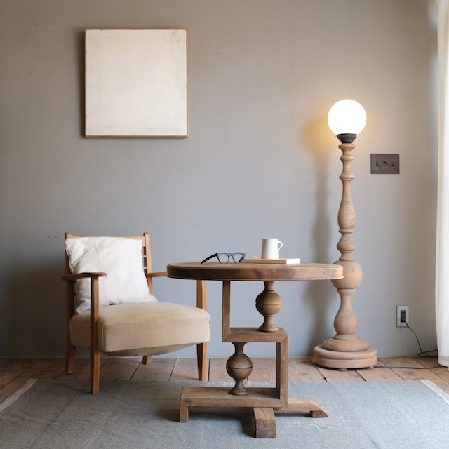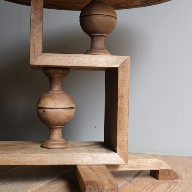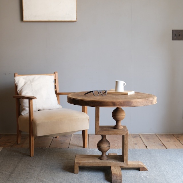 装飾性の高いラウンドテーブル、支柱にある2個のろくろ装飾がリズミカルに配置されたて、ぐっとインテリアセンスを格上げをしてくれる家具です。まるでアート作品を眺めているような佇まいです。