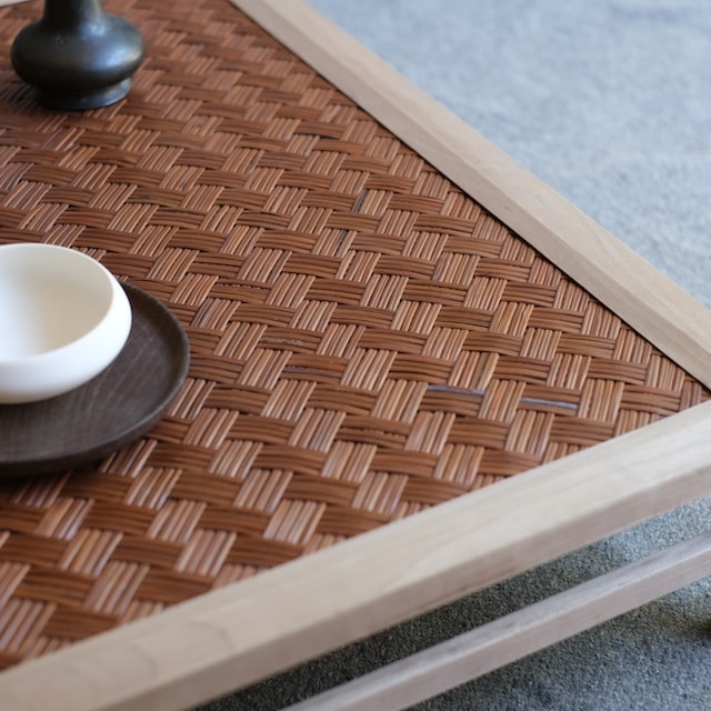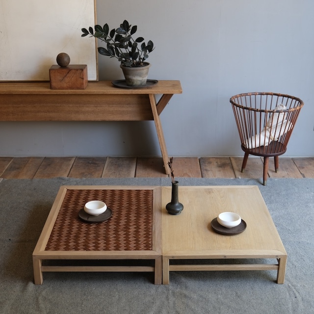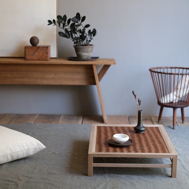 籐の網代編み天板の展示台。網代編みがとても雰囲気がよく展示できます。高さがとても低いローテーブルですので、お部屋を広く見せてくれます。