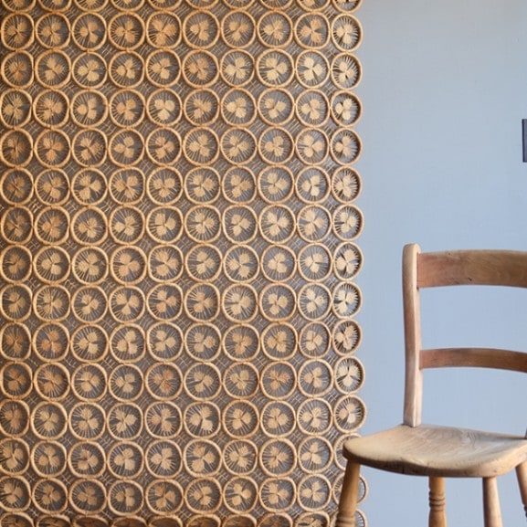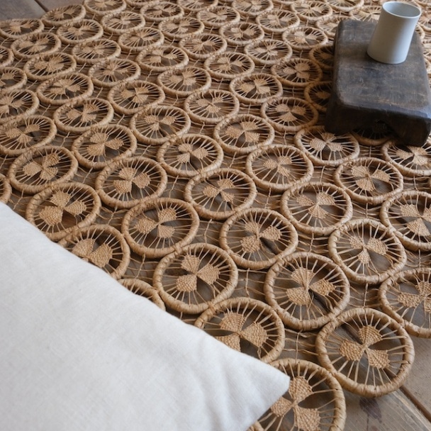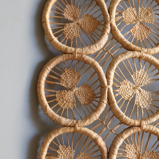 円形の中にクローバーのようなモチーフが連なっています。ラフィアで編まれたとても可愛らしいアイテムです。壁にかけてタペストリーのように飾れば、一気にお部屋の雰囲気が上がります。またラグのように敷いても特別なスペースとなります。