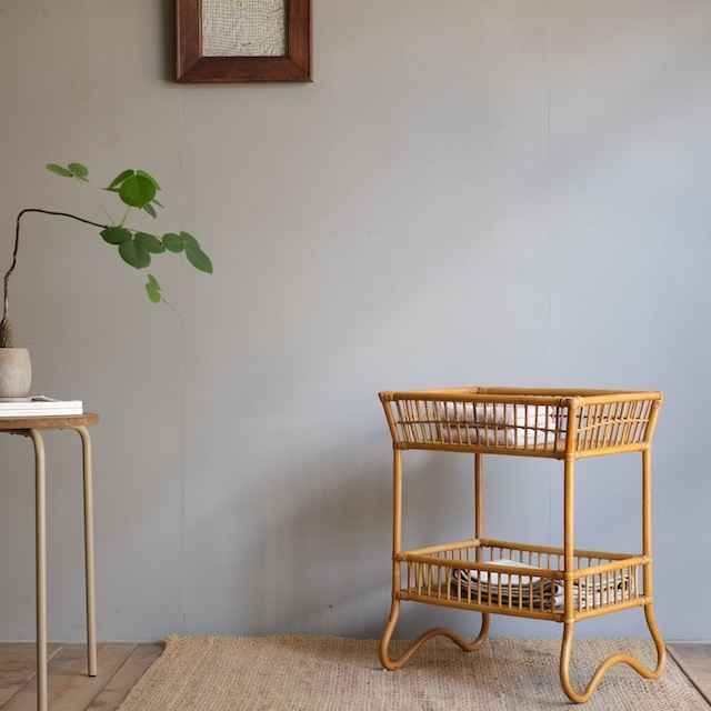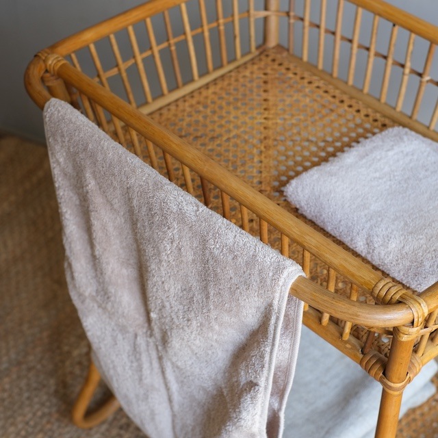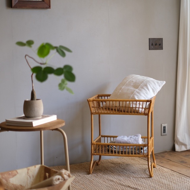 籐でできた脚付きのランドリーバスケット。上下2段の大きなバスケットが付いて収納力があります。脱衣部屋で温かみを感じるアイテムです。その他、子供のおもちゃを収納したり、趣味の裁縫道具や生地を収納したりも素敵です。