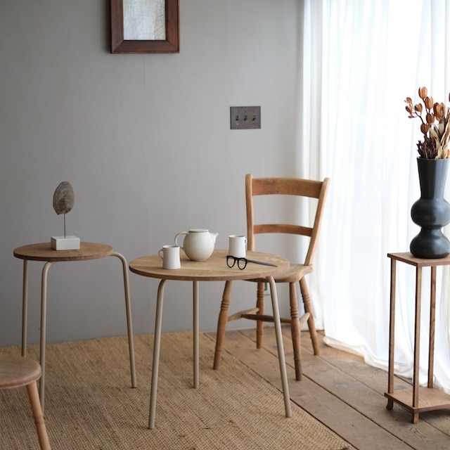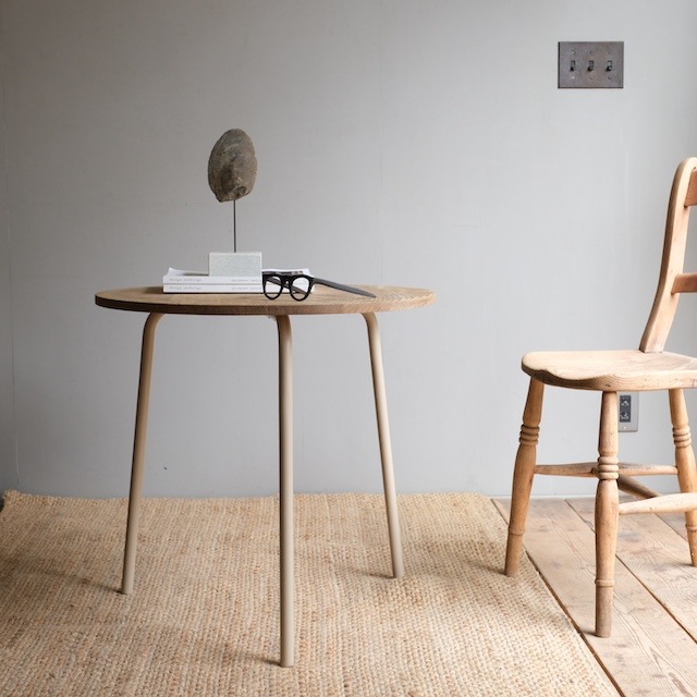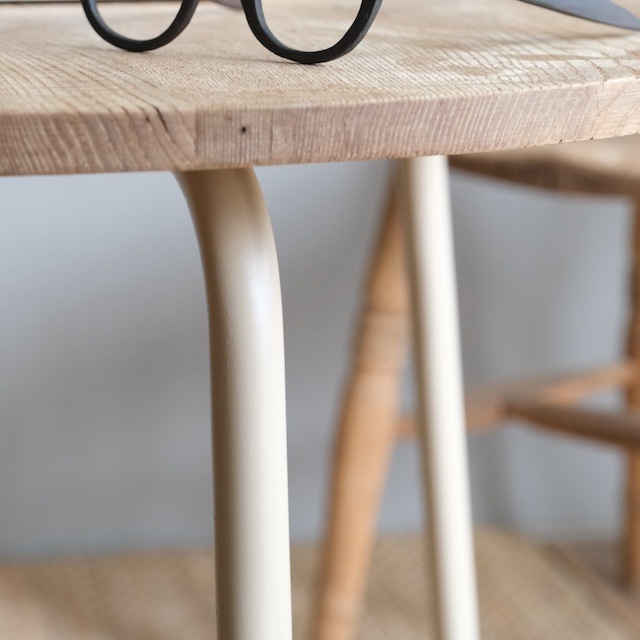 鉄脚のシンプルなラウンドテーブル、すっきりとした形です。鉄脚は落ち着いたベージュに再塗装しました。ナチュラルな無垢の天板とベージュの組み合わせは、温かみがあり優しい雰囲気を演出します。