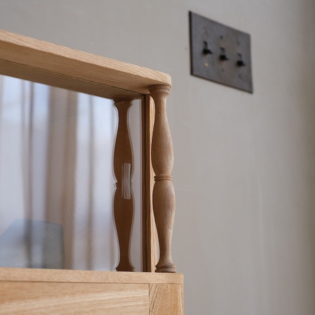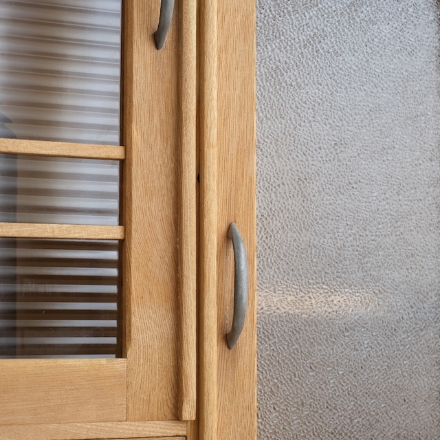 左右の構成が違うアシンメトリーキャビネット。開きガラス扉、ガラス引き戸、引き出しと機能性に富んでいます。ガラスはクリアガラスとダイヤガラスとモールガラスが使われ、遊び心がありますね。食器棚のような使い方、本箱のような使い方など、使う人の好みに合わせて愉しめるキャビネットです。