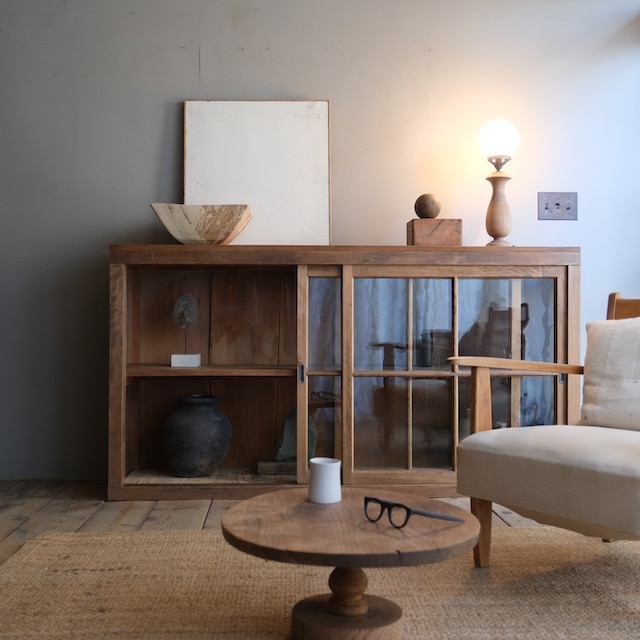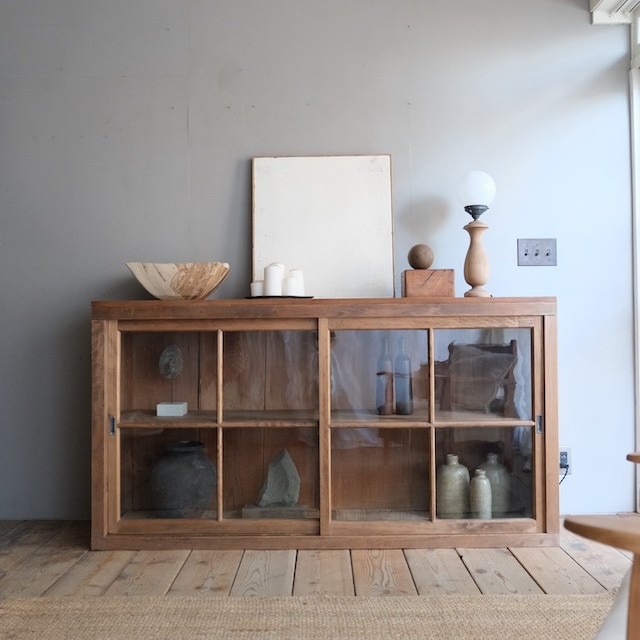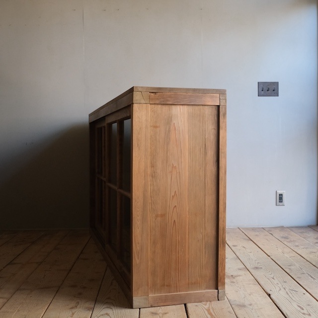 奥行きがあまりなく横長タイプのキャビネット。十字の格子が入ったガラス扉が窓からの眺めのようで素敵です。天板に無垢板を取り付けましたので、重めの物を飾っても安定感があります。キッチンでは食器棚やカウンター台にしたり、リビングではテレビボードやキャビネットにしたりと、使い勝手の良い家具だと思います。またショップ什器としてもいいと思います。