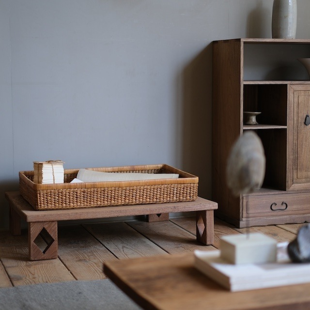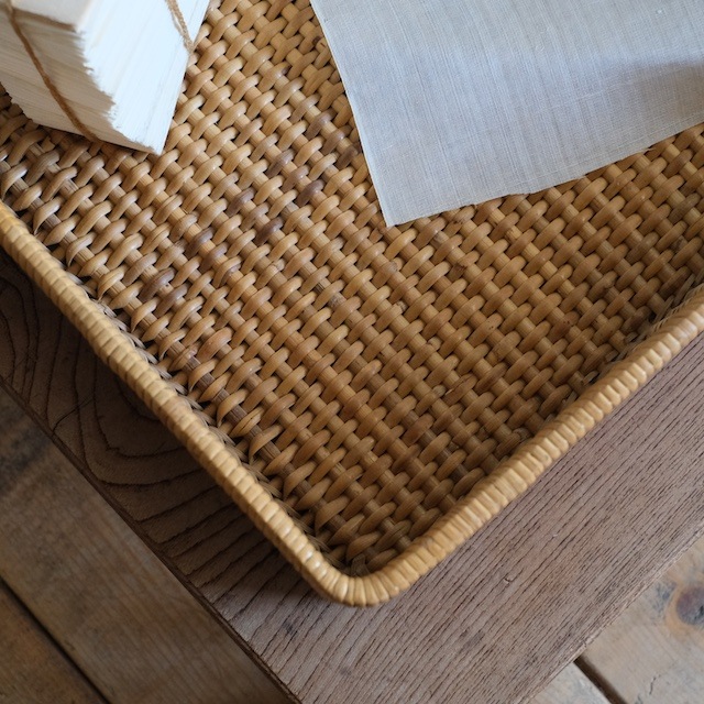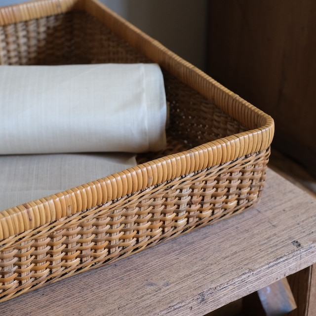 皮籐で編んだシンプルな四角い衣装籠。皮籐の表面はツルツルとしたエナメル質になっています。手触りが良く、見た目も良いです。この表面をどちらにして編むかを考えられて編んでいます。エナメル質を外側にして編むのが一般的ですfが、底面は内側にして編んでします。これは布が引っ掛かってしまうのことを防ぐための工夫がされています。