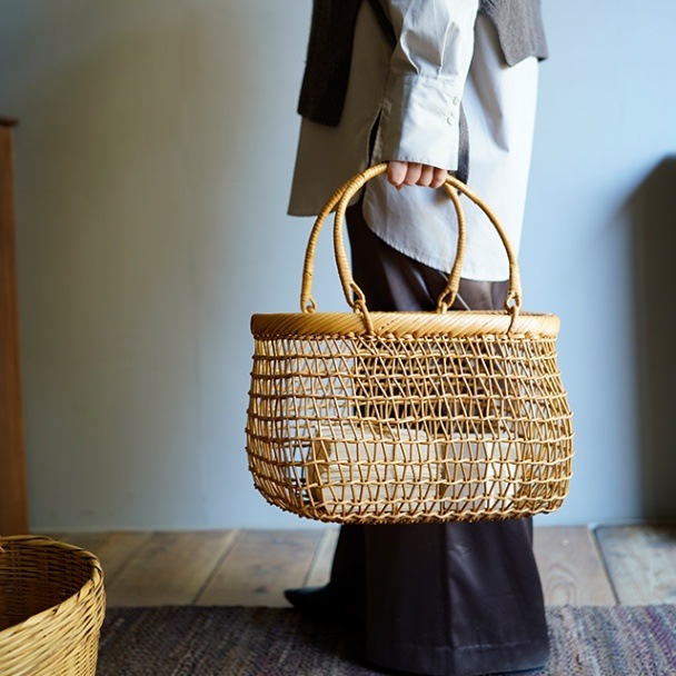 ぽってりとした形が可愛らしい籐製の手提げ籠。透かし編みで中の物が程よく見え軽やかな印象です。持ち運びも軽く、お出かけの時に負担にならずとても使いやすいです。