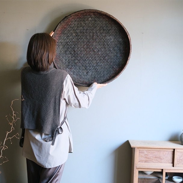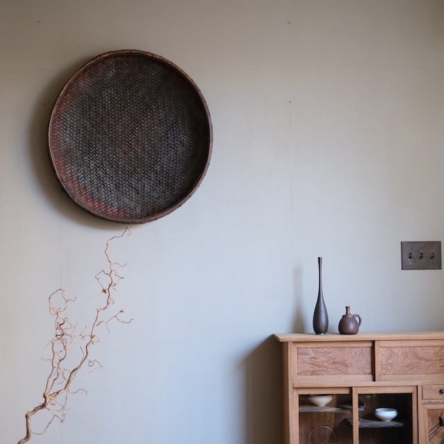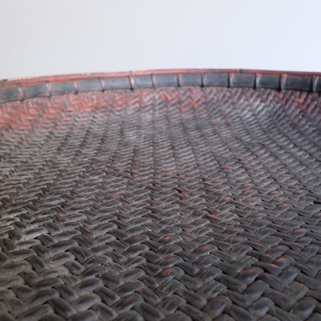 竹で編まれた大きな笊。時代を纏った黒に近い深みのある色。網代に編んだ質感は自然な色むらが美しく、壁に飾って愉しむことができます。