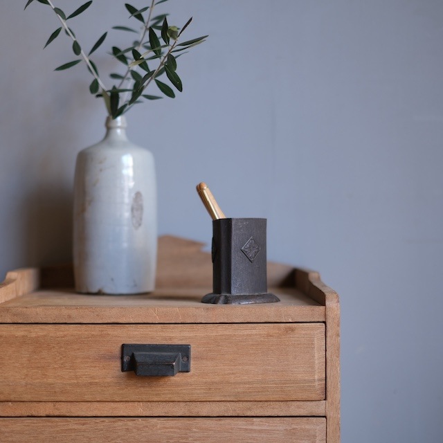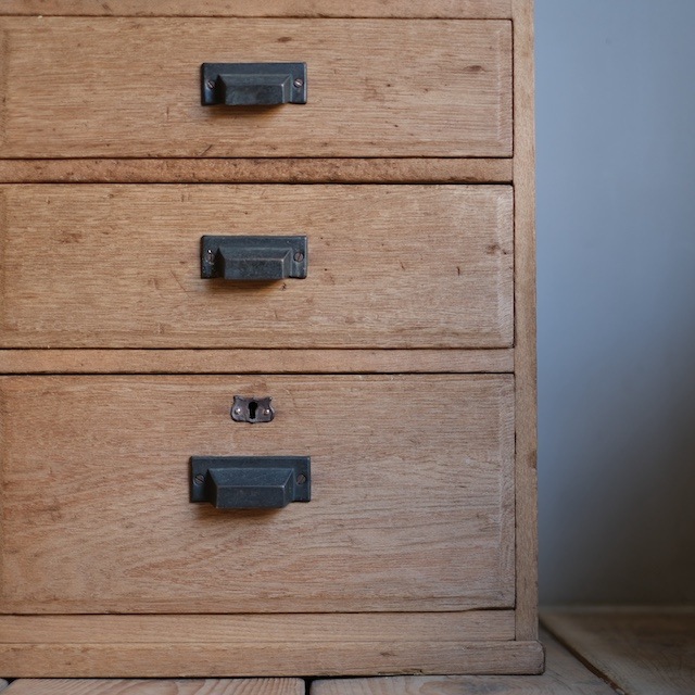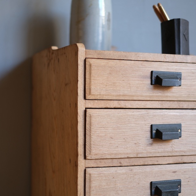 程よいサイズ感の引き出し。引き出しの前面は額縁のようになった、ちょっぴり上品な造りです。取っ手はカッコよくオシャレな印象のスクエア取っ手です。