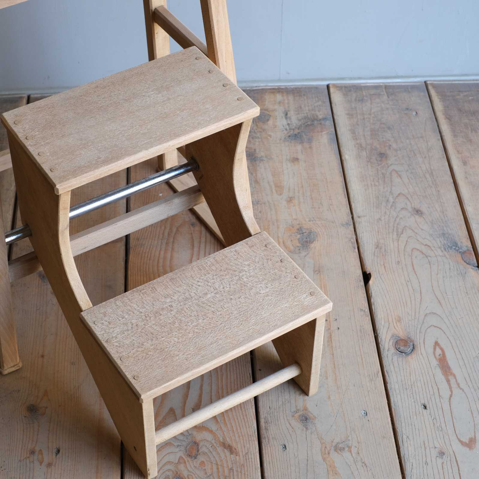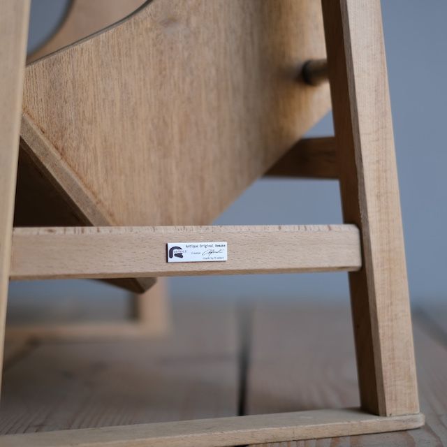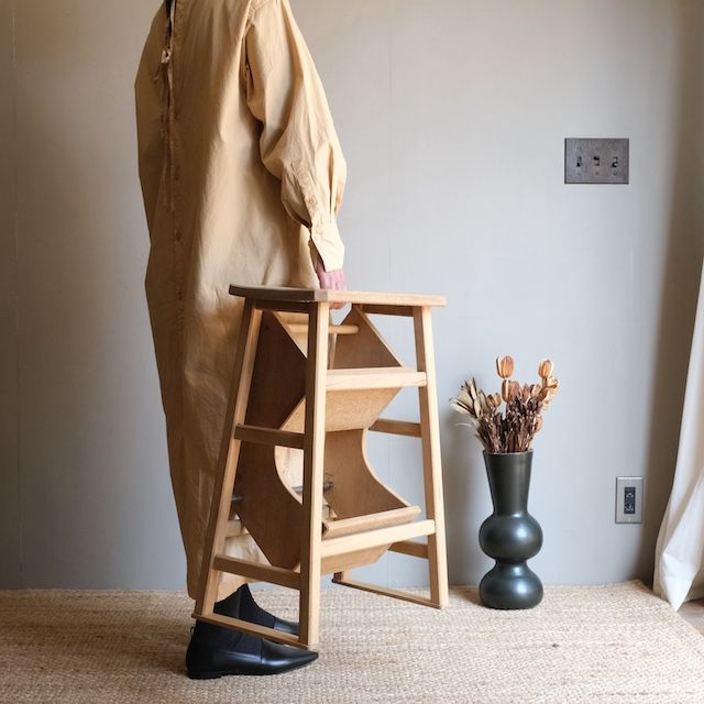 くるんと階段部分を出せば踏台になる回転式踏台、閉まっている時は椅子や台として使えます。こちらは古い塗装を剥いだ後、ソープ仕上げをした『R-select リデザインプロダクト』です。ソープ仕上げは色味が無塗装のナチュラルな木肌のまま、さらっとした滑らかな手触りが特長です。踏台の中でも、足の設置面が広いので、安定感のある登り降りができます。また、奥行きのある立体的な陳列ができて、より楽しむことができます。