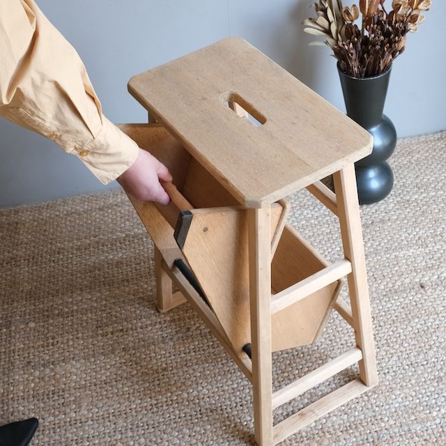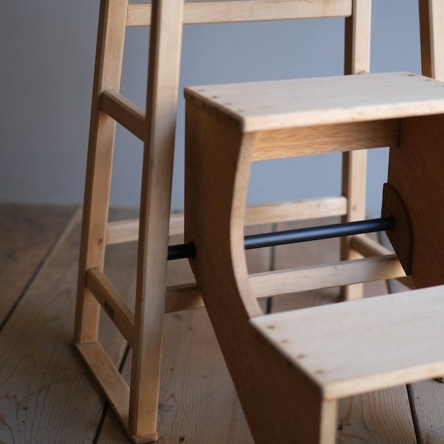 くるんと階段部分を出せば踏台になる回転式踏台、閉まっている時は椅子や台として使えます。こちらは古い塗装を剥いだ後、ソープ仕上げをした『R-select リデザインプロダクト』です。ソープ仕上げは色味が無塗装のナチュラルな木肌のまま、さらっとした滑らかな手触りが特長です。踏台の中でも、足の設置面が広いので、安定感のある登り降りができます。また、奥行きのある立体的な陳列ができて、より楽しむことができます。