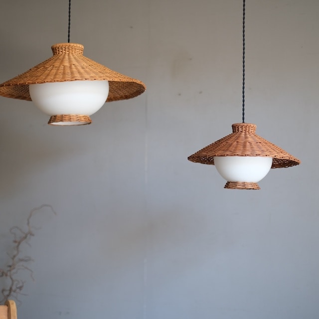 籐と乳白ガラスの組み合わせが素敵なペンダントライト。籐の円錐シェードと乳白ガラスの球体が織りなす、穏やかな光です。