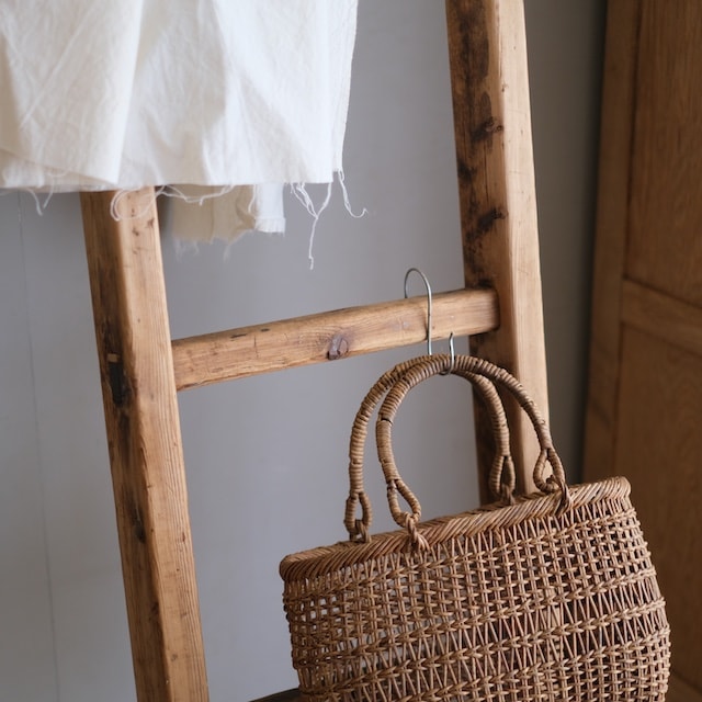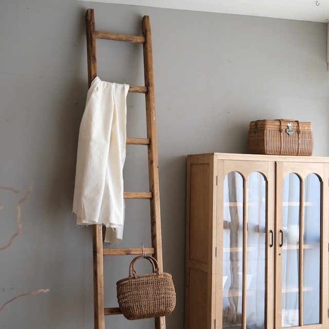 素朴でプリミティブな風合いが魅力の梯子。経年変化した木の凹凸や無骨な感じが、とてもいい雰囲気です。そのままでも絵になる梯子ですが、布を掛けたり、帽子やバッグを掛けたりとラックとしての使い方も素敵です。