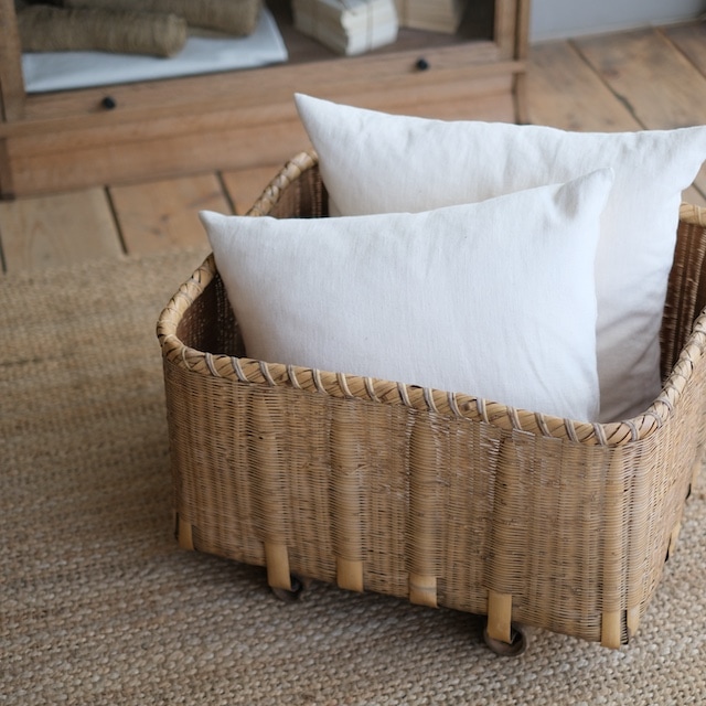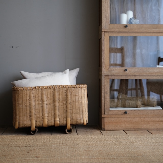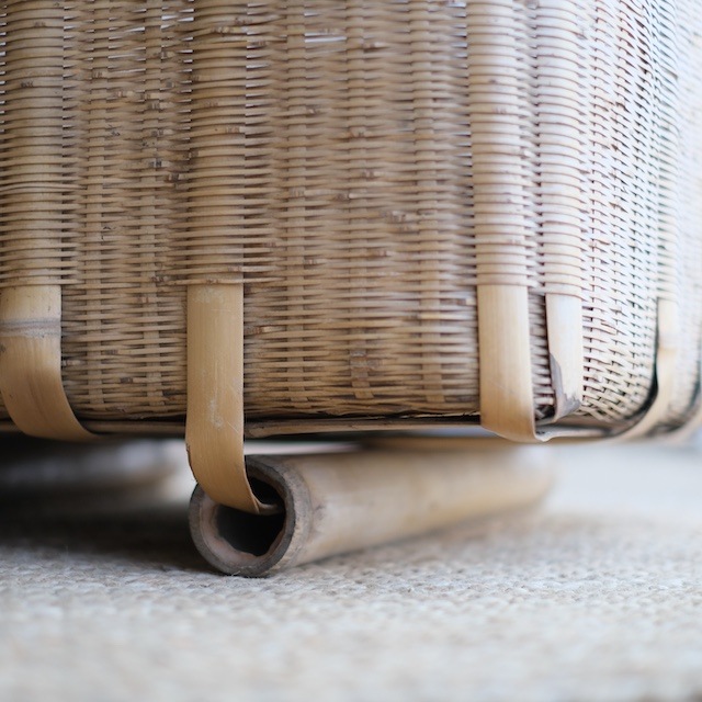 とても大きな竹籠。たっぷりと収納できます。2本の竹足が付いた特長的なスタイルです。通気性がとても良いですね。