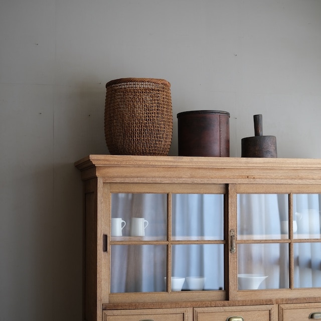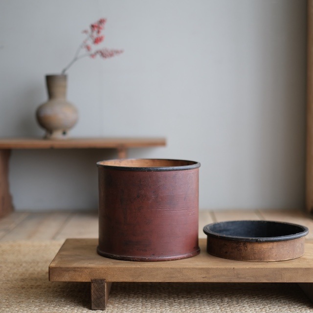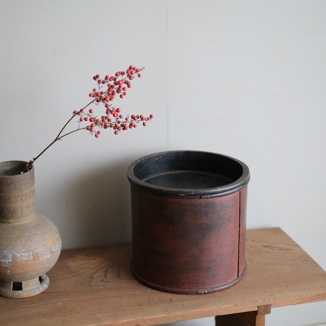曲げわっぱのような作りの木の円筒型ボックスで、こちらは「おぼけ」という、自然糸を入れていた古道具です。蓋の部分も器になっています。シンプルな形ですので、どんなものを収納してもサマになりますね。