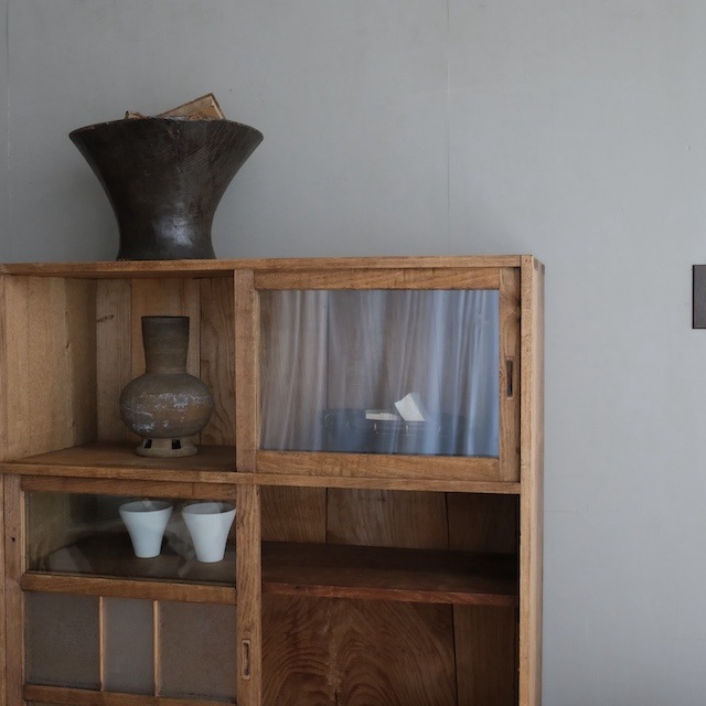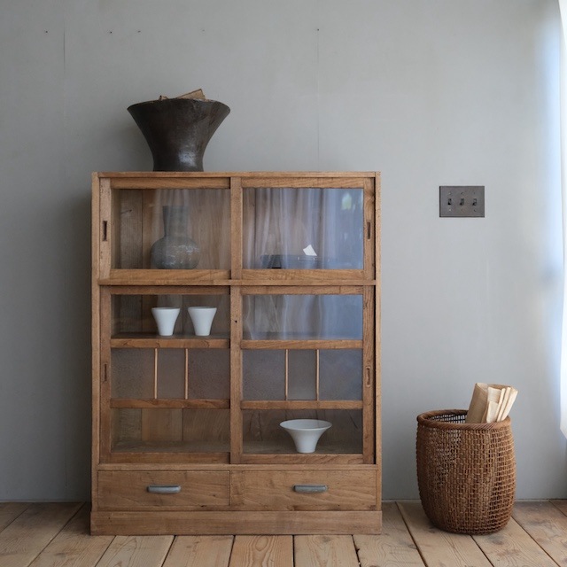 2段の引き戸式キャビネットです。下段の引き戸には結霜ガラスとレトロガラスの飾りが入っています。落ち着いた色味の木地と、力強く感じる杢目ですので、趣のあるインテリアに似合うキャビネットです。