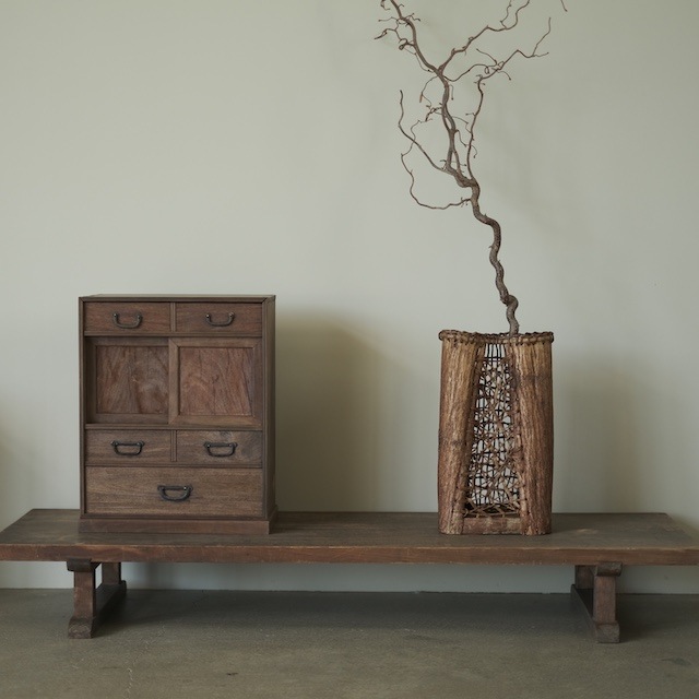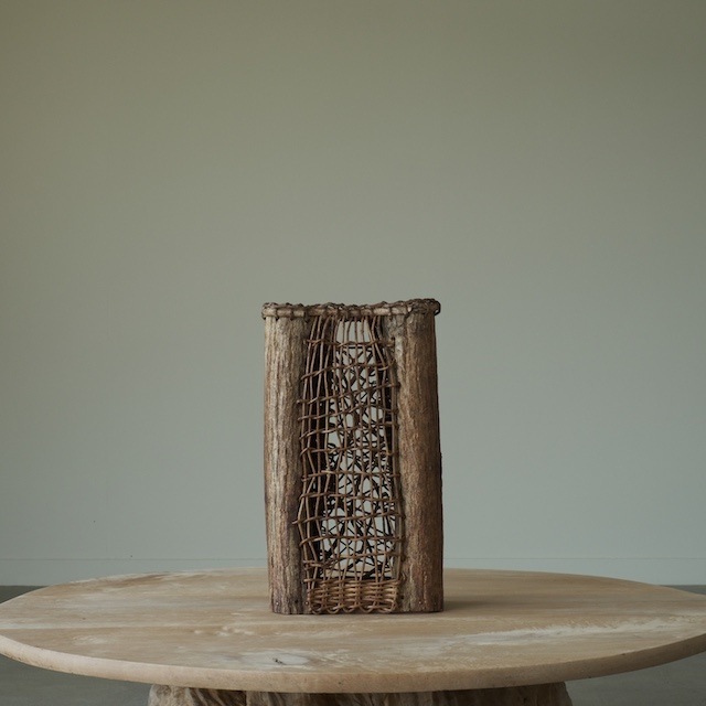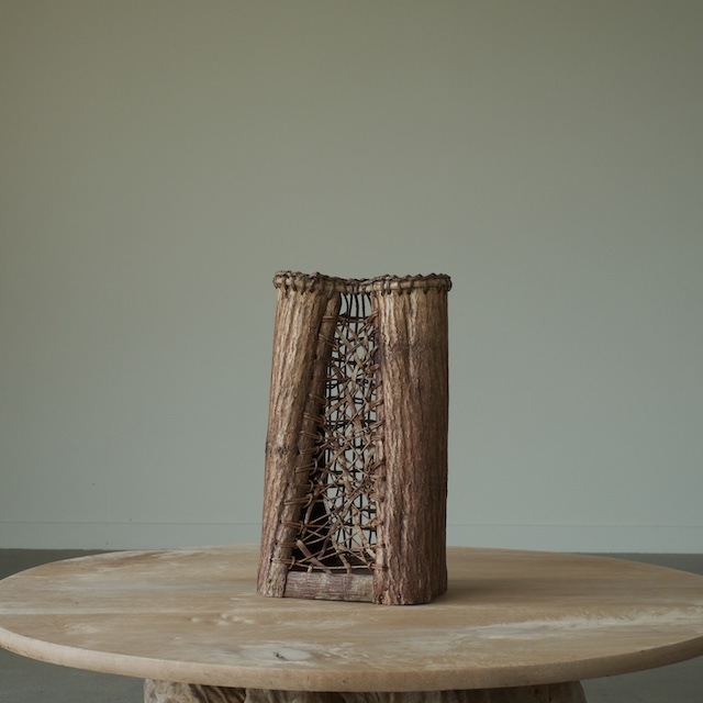 荒々しくも美しい樹皮と、素朴に編まれたあけび蔓。 自然素材がもつ異なる表情が、ひとつの籠の中で響き合います。 無骨さと繊細さのコントラストが、空間に独特の緊張感と静けさをもたらします。 枝物やドライフラワーを飾っても絵になり、印象的なアートオブジェとして愉しめます。