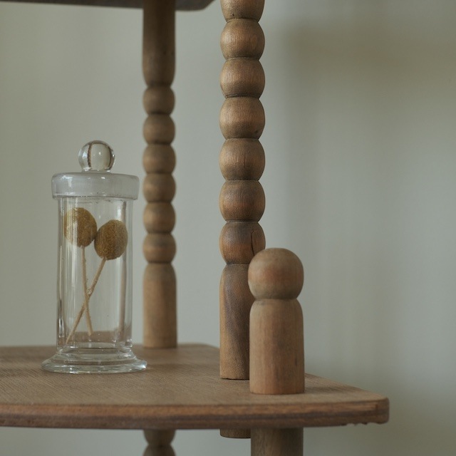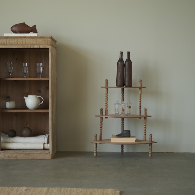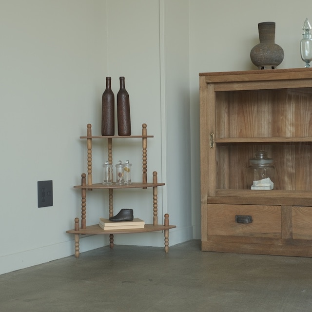 木肌のやさしさと、ぽこぽことした支柱のリズムが印象的な三段のコーナーラック。