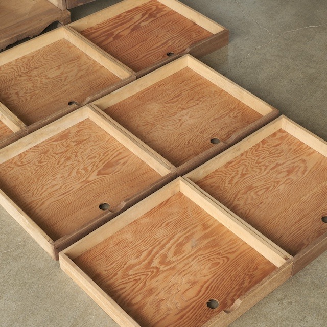 かつてはレコードを収めるためのキャビネットとして使われていた一台。扉を開けると、薄く仕切られた7杯の引き出しが整然と並び、紙や布などの軽やかな素材を収納するのに最適な造りです。引き出しの高さが浅めに設計されているため、中身を一目で見渡せ、どこに何が入っているかがすぐにわかるのも特長です。