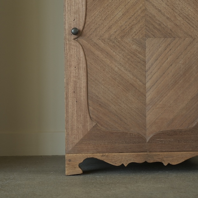 扉には繊細な面取りと寄木のような意匠が施され、直線と曲線が交わる独特のリズムを生み出しています。脚元のやわらかな装飾も相まって、全体に柔和な空気が漂います。