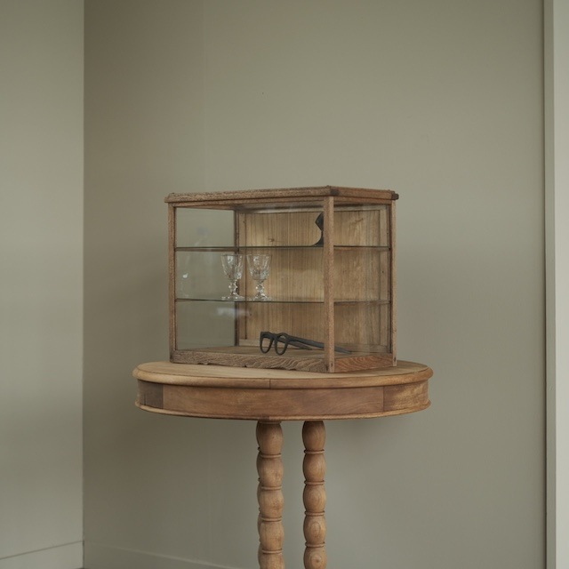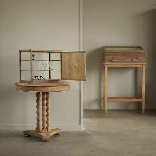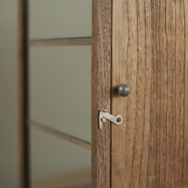 木のフレームに透明ガラスを組み合わせた、棚付きの卓上ガラスケース。 中に飾るものが主役になるように、装飾は控えめに。素朴でまっすぐな佇まいが魅力です。 ガラス棚は取り外し可能で、器やグラス、小さなオブジェなどの展示にちょうど良いサイズ感。 扉は片開きで、小さなつまみがさりげないアクセントになっています。 飾るものによって表情を変え、空間に静けさと奥行きをもたらす、小さな展示台のような一台です。