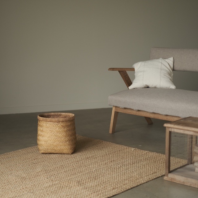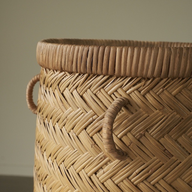 底が四角く、上部が円形に仕立てられた竹籠。四角い底はしっかりと安定し、収納物が収まりやすい形状。上部はやわらかな丸みを持たせ、手にしたときの印象も軽やかです。