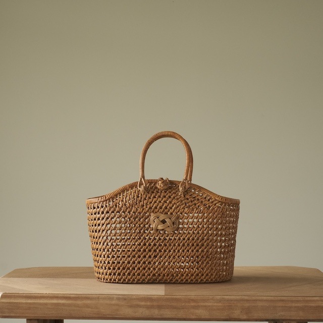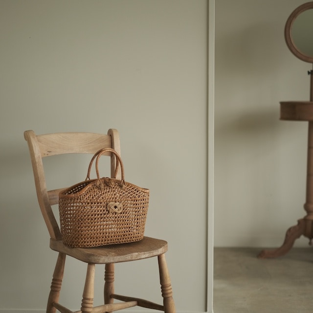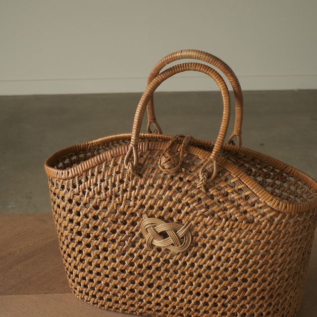 皮籐をしなやかに編み上げた、透かし編みの手提げ籠。素材の艶と質感が生かされ、軽やかで涼やかな印象を与えます。口縁は美しい曲線を描き、籠全体の輪郭をやわらかく引き立てています。中央には結び飾りがあしらわれ、留め具がある丁寧な仕立て。持ち手はしっかりと巻き仕上げが施され、全体の状態も非常に良好です。お出かけ用としてはもちろん、室内での収納やディスプレイにも映える一点です。