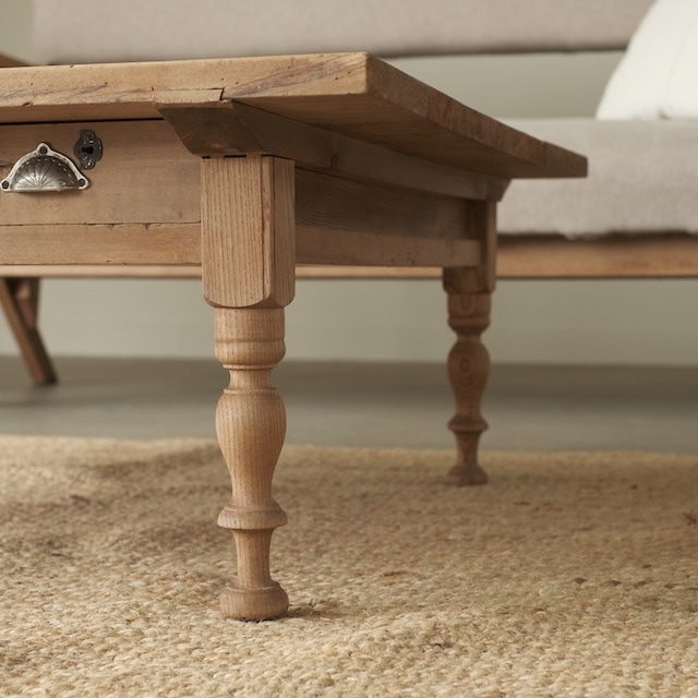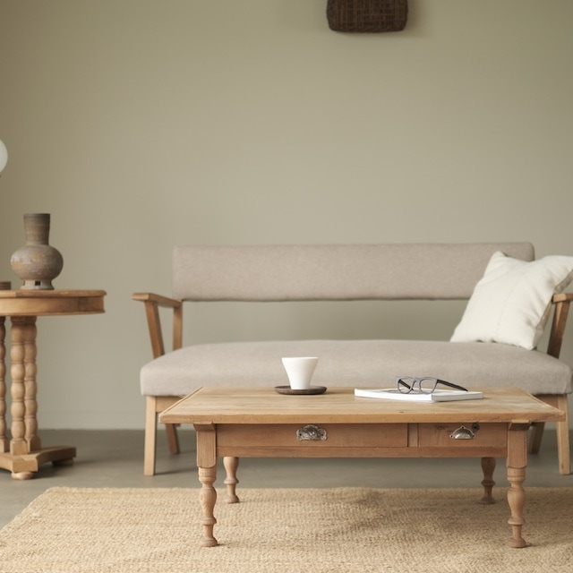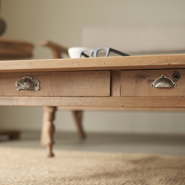 やわらかな木肌に経年の味わいを宿した、引き出し付きのローテーブル。二杯の引き出しは大きさが異なり、取っ手もそれぞれ異なる意匠が施されています。装飾性のある取っ手は、古びた風合いの中に華やかさをそっと添え、ろくろ脚の柔らかな曲線とともにクラシカルな雰囲気を演出します。天板は程よい広さで、リビングのセンターテーブルとしてはもちろん、ゆったりとした作業台としても活躍。家具としての実用性と、眺めて愉しむ美しさの両方を備えた一台です。