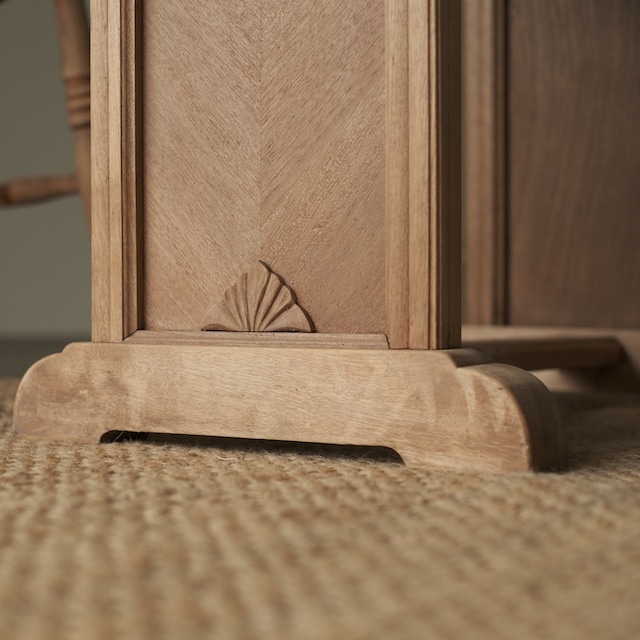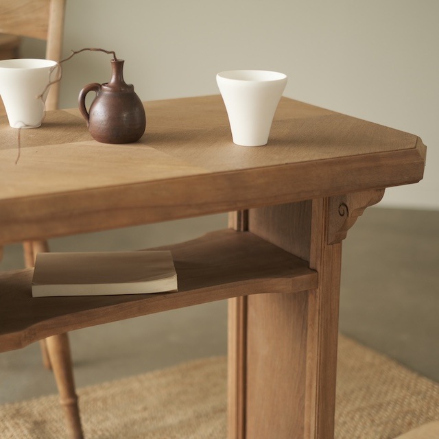 寄木細工のような表情を持つ天板と、随所に施された小さな彫刻が魅力のコンパクトテーブル。脚元や幕板にさりげなくあしらわれた装飾は、家具としての品格をそっと高めています。明るく柔らかな木肌は、空間を軽やかに見せながらも、落ち着いた雰囲気を添えてくれます。ダイニングの片隅やカフェテーブルとして、二人掛けにちょうどよいサイズ感。限られたスペースでも存在感を放つ、個性豊かな一台です。