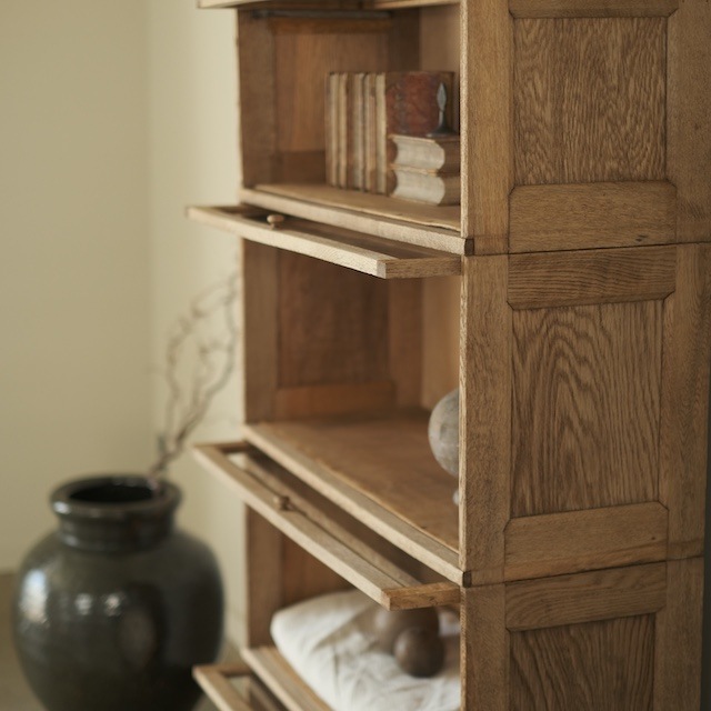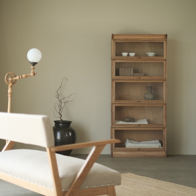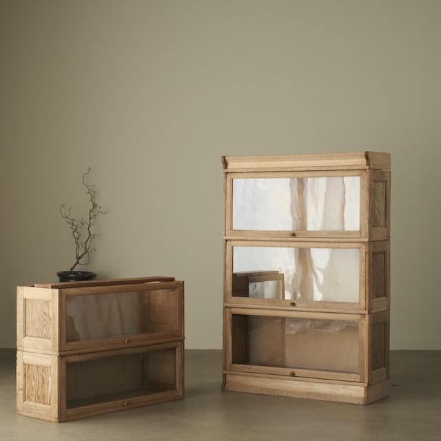 扉を上に持ち上げて内部に仕舞う「フラップ扉」のショーケース。上下ユニットと5段のケースで構成した、計7パーツの組み合わせ式収納です。段数を自在に組み替えられるため、設置場所や収納量に合わせた使い方が可能。正面のガラス面が空間に光を取り込み、収納でありながらディスプレイとしての美しさを引き立てます。