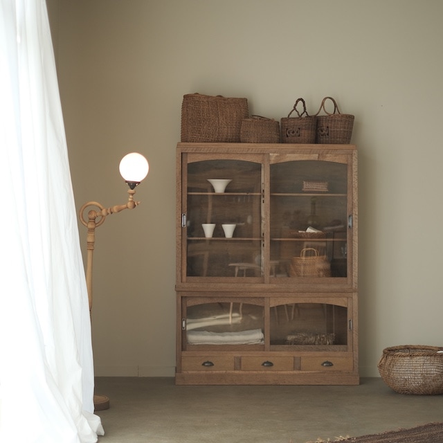 アーチを描くガラス扉と、上下で分かれた構造が印象的な楢材のキャビネット。