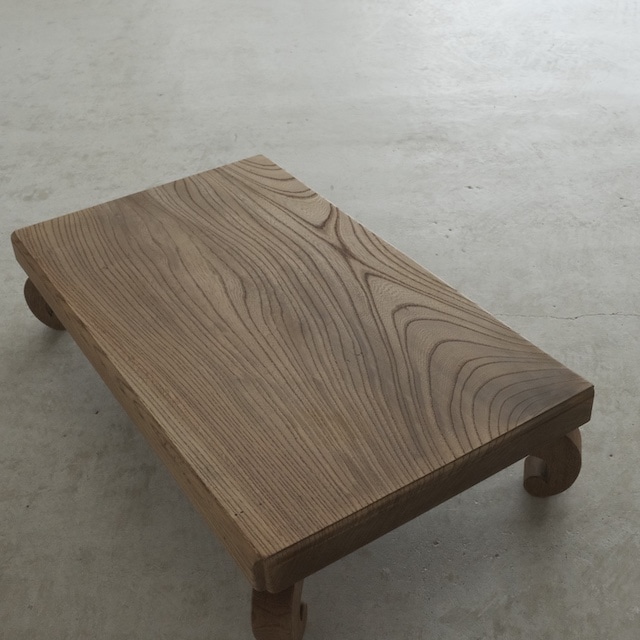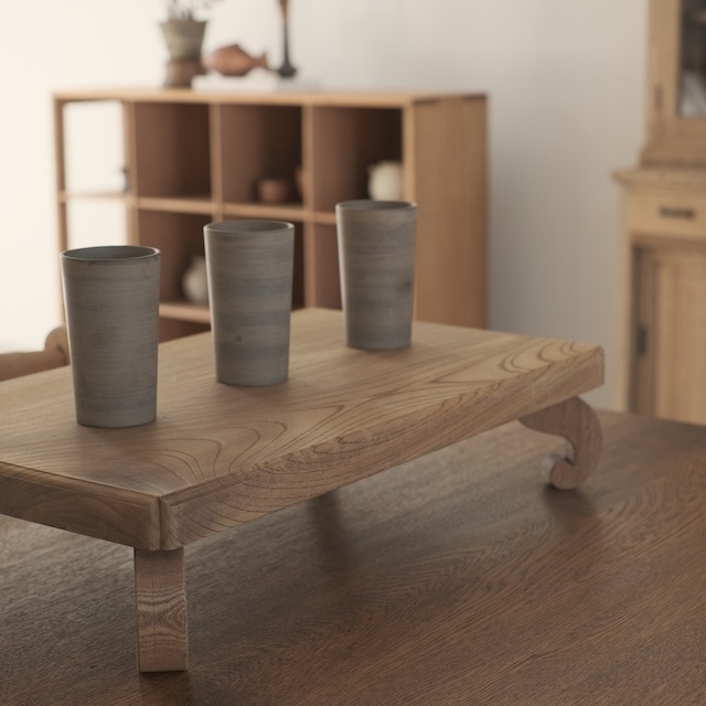 欅材で仕立てられた展示台。 深く流れる木目が印象的です。 脚部には古い家具に見られる意匠を取り入れ、 柔らかな曲線が天板を軽やかに支えています。 装飾的でありながら控えめな佇まいは、 飾るものを引き立て、空間に穏やかな緊張感を添えます。 器やオブジェをひとつ置くだけで、 素材の美しさと造形の静けさが際立つ一台です。