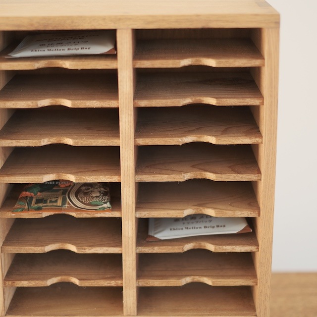 紙類の収納に適し、名刺・ショップカードなどの収納に、キッチン周りでも、コーヒードリップパックやティーバッグの収納にちょうどよいサイズ感です。