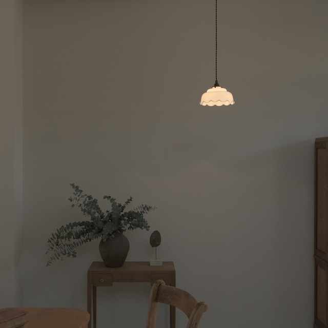 ふんわりと波打つ縁取りが印象的な、乳白ガラスのペンダントライト。