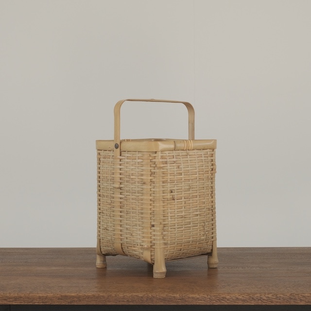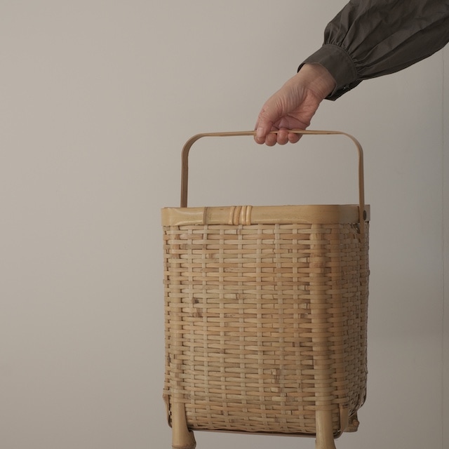 丈夫な竹を用いて、しっかりと編み上げられた脚付きの籠。 四角い縦長のかたちは、ランドリーボックスや布ものの収納、 高さのある日用品の整理にも向いています。 底部には脚が設けられており、床からわずかに浮いた佇まい。 湿気を逃がしやすく、空間に軽やかな抜け感を与えてくれます。 四角いフォルムに対して、持ち手の曲線がやわらかなアクセントに。 あまり見かけない縦型・脚付きの構造は、 収納としてだけでなく、置いてある姿そのものが印象的です。