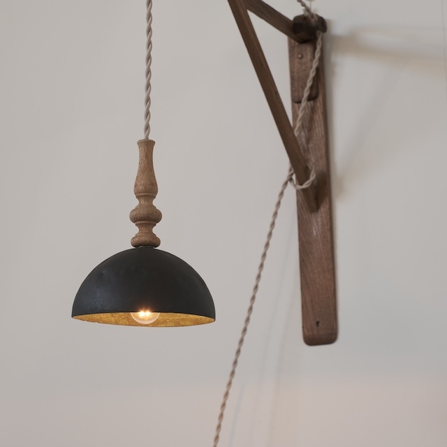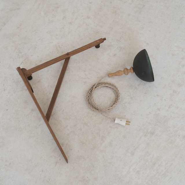 銅のシェードと、ろくろ加工の木部支柱を組み合わせています。
