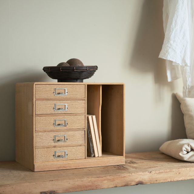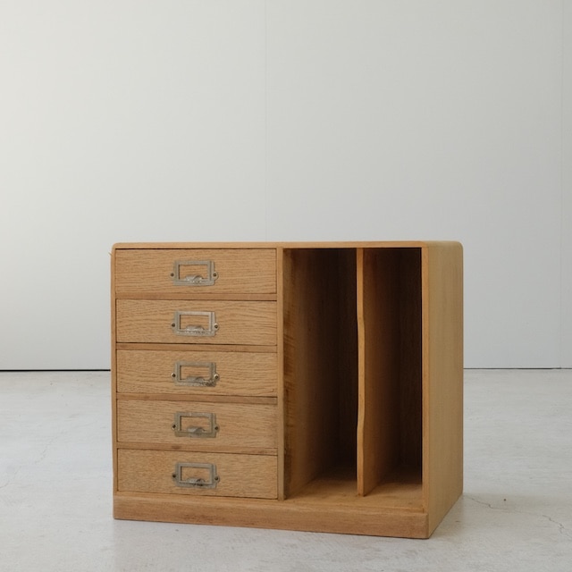 引き出しと本立てが一体になった収納箱。 引き出しには文房具や小物、道具類などを。 隣のスペースには本やノート、書類などを立てて収納できます。 机の上やソファ横に置くと、散らばりがちなものをまとめて整理できる便利なつくり。 小さな家具のように、暮らしのそばで活躍してくれる収納箱です。