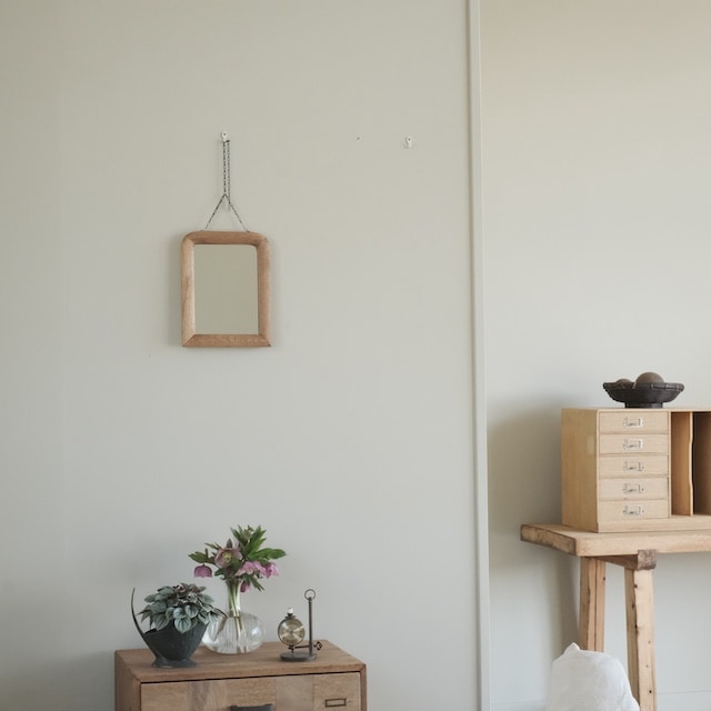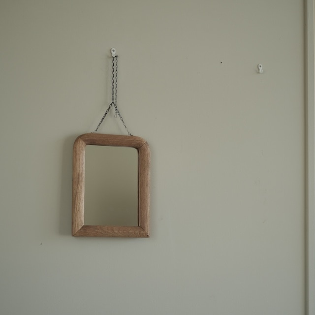 鎖で吊るして使う、小ぶりな壁掛け鏡です。 コンパクトなサイズで、玄関やちょっとした壁面にも取り入れやすい一枚。 木枠のやわらかな質感と、軽やかな佇まいが空間に自然と馴染みます。 鏡面は新しいものに交換済みのため、実用としても安心してお使いいただけます。