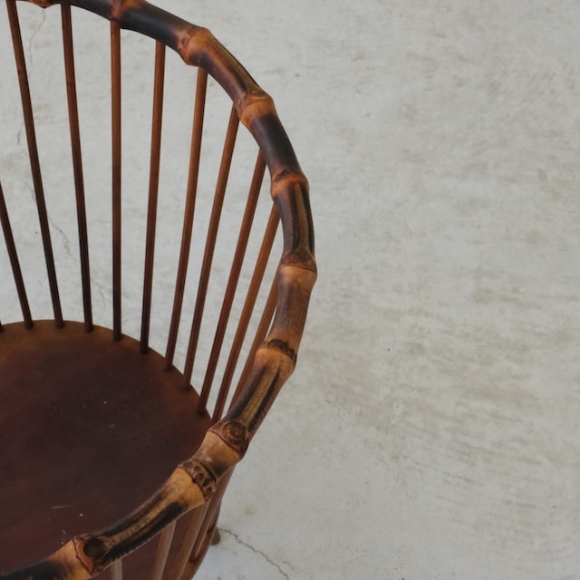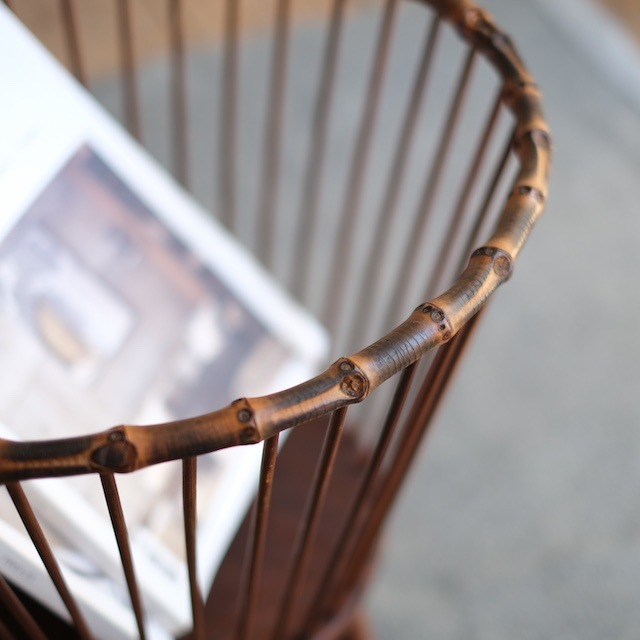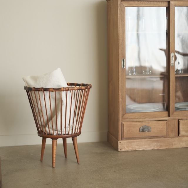 美しいフォルムが印象的な、木製の入れ物です。 三本脚の軽やかな佇まいがとても洒落ており、上部にあしらわれた根竹の表情が、全体に上品なアクセントを添えています。 マガジンラックとして雑誌を入れたり、スリッパラックとして玄関に置いたり、ブランケットや布ものをラフに収める収納としても。 置くだけで空間にさりげない存在感を添えてくれる、実用性と装飾性をあわせ持ったアイテムです。