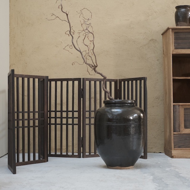 六連の古い帳場格子。 格子が連なる端正なデザインで、広がりのある長さがあり、空間をゆるやかに仕切ることができます。古い木の色合いや表情が残り、置くだけでも雰囲気のある佇まいです。 お部屋の間仕切りとしてはもちろん、壁際に立てて背景のように使ったり、インテリアのアクセントとして取り入れるのもおすすめです。 折りたたむことができるため、使わないときはコンパクトに収めることもできます。