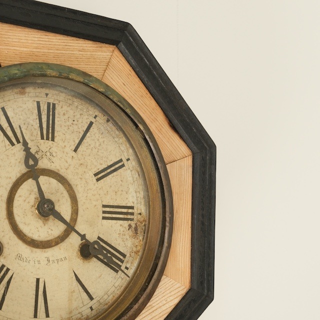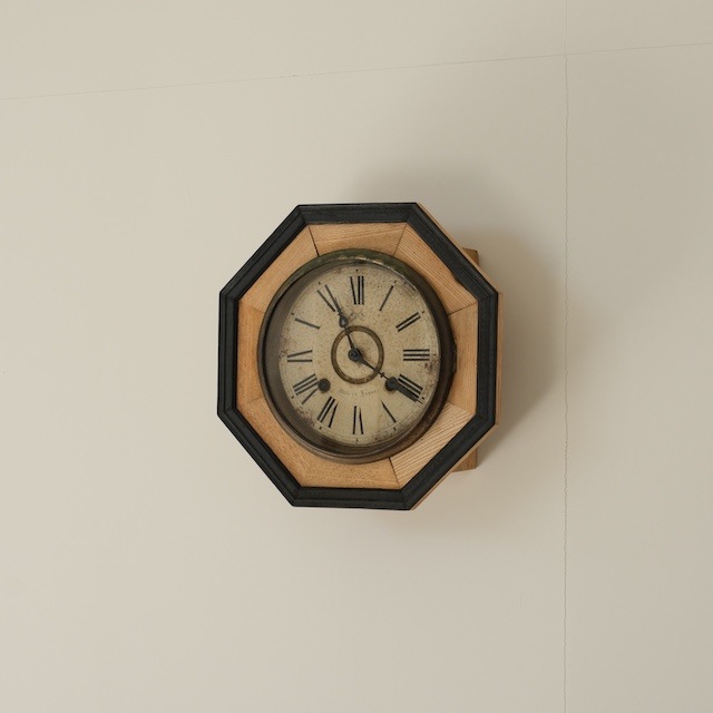 古い塗装を丁寧に剥離し、木の質感を活かした仕上げに整えています。針は当時のものをそのまま使用し、現代のムーブメントに合わせて再構成しています。