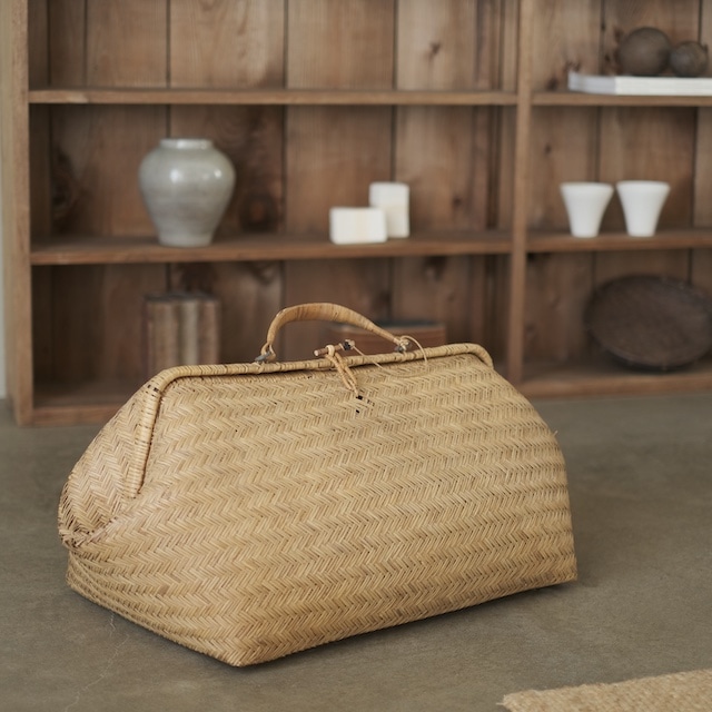竹で編まれた、ボストンバッグ型の籠。 このかたちは非常に珍しく、高い技術が求められるつくりです。 松本の「みすず細工」による、輸出用として製作されたものと思われます。 特に側面の、やわらかく折れ曲がるような造形が美しく、 素材のしなやかさと編みの技術がよく表れています。 実用性だけでなく、造形としても見応えのある一品です。